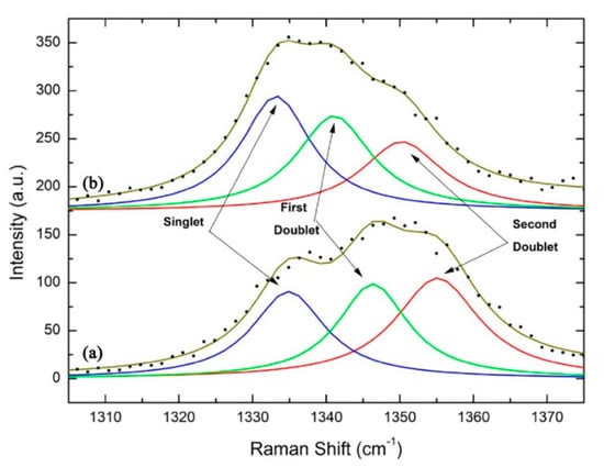 The singlet and doublets behavior on diamond film residual stress: (a) with 9 μm and (b) with 31 μm of the vanadium carbide intermediate layer. (Reproduced with permission from [31]).