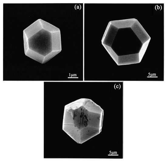 Zhu et al. reported that diamond deposition on Fe, Co, and Ni has been achieved by a multi-step CVD process consisting of (i) seeding the substrate with diamond powders, (ii) annealing the seeded substrate in hydrogen at high temperatures, and (iii) diamond nucleation and growth [36]. Through the optimization and precise controls of the residence time of source gas during hot-filament CVD, diamond was successfully directly deposited on steel by Nakamura et al. [37] and Kohmura et al. [38], respectively. They suggested that the diamond film with excellent crystalline quality could be obtained by appropriate balance between the growth rate of diamond and the graphite etched rate by hydrogen. The SEM micrographs of diamond grains grown on silicon, stainless steel, and iron substrates under the special controls of the hot-filament CVD process by Nakamura et al. [37] are shown in Figure 3.