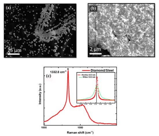 Microdiamonds can formed on steel substrates by hot-filament chemical vapor deposition (CVD), using the Q-carbon seeds formed after single-pulse pulsed laser annealing at 1.1 J/cm2: (a) SEM micrograph (b) The enlarged SEM micrograph and (c) Raman spectrum of the formed microdiamonds. (Reproduced with permission from [44]).