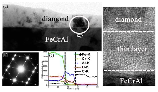 In order to clarify the fundamental mechanism of the Al alloying element in promoting diamond growth and enhancing interfacial adhesion, fine structure and chemical analysis around the diamond film–substrate interface have been comprehensively characterized by TEM [52]. A comparative study of diamond films formed on different alloy substrates such as pure Fe, Fe-Cr, Fe-Al, and Fe-Cr-Al alloy is conducted. A very thin Al-rich amorphous oxide sublayer is always identified between the diamond film and Fe-Cr-Al substrate interface, as shown in Figure 6. Figure 6a is the cross-sectional TEM image of the adherent film formed on the Fe-Cr-Al substrate, with the electron diffraction pattern (Figure 6b) indicating that the phase in the film is diamond. Figure 6c is an energy dispersive spectrometer (EDS) line scan profile, scanned along from the substrate to the diamond film. The interfacial layer is separated by the vertical lines in the EDS line-scan profile. In this region, the content of element Al is much higher than that in the substrate, whereas there is nearly no Fe and Cr. In the high-resolution TEM (HRTEM) image of Figure 6d, a narrow interfacial layer located between the substrate and the diamond film is clearly seen, which is amorphous and is about 10–15 nm thick. These data imply that a thin Al-rich amorphous interfacial layer with several nanometers in thickness in situ formed along the Fe-Cr-Al substrate/diamond film interface.