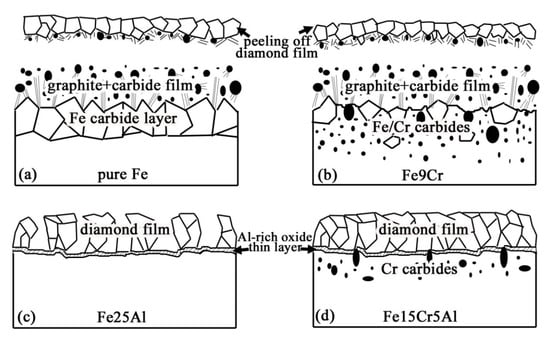 The in situ formation of an amorphous, nanometer scale, Al-rich oxide passive layer at the interface between the diamond film and the substrate plays a crucial role for diamond nucleation, growth, and adhesion, as it acts as an efficient barrier for C diffusion and Fe catalyzed graphite formation. Meanwhile, a synergetic effect of Cr alloying element in Fe-Cr-Al substrate is also useful, which can reduce the fraction of Al, decrease substrate thermal-expansion coefficient, and simultaneously have a mechanical interlocking effect due to the formation of interfacial chromium carbides. Accordingly, a mechanism model is proposed (as shown in Figure 7) to account for the different interfacial adhesion of diamond films grown on the various Fe-based substrates [52].
