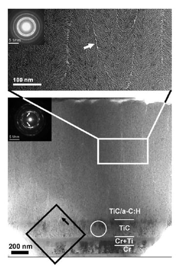 - Galvan, D.; Pei, Y.T.; De Hosson, J.T.M. TEM characterization of a Cr/Ti/TiC graded interlayer for magnetron-sputtered TiC/a-C:H nanocomposite coatings. Acta Mater. 2005, 53, 3925–3934. [Google Scholar] [CrossRef]