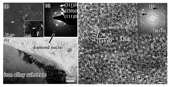 The interfacial region between initial diamond and Fe-Cr-Al substrate is shown in Figure 10. As an amorphous thin Al-rich oxide layer would in-situ quickly form on Fe-Cr-Al substrate, the formation of a graphite interlayer is effectively hindered. The Fe-Cr-Al substrate maintains as α-Fe phase, and no Fe3C carbide forms on the substrate surface, by contrast with that on iron substrate which forms a thick Fe3C carbide layer. Consequently, the precipitation of graphite from Fe3C carbide cannot occur on Fe-Cr-Al substrate. Instead, diamond could directly nucleate and grow on the Fe-Cr-Al substrate surface. The SEM image in Figure 10a is the sample being deposited for very short time, showing that at the very early stage only some small diamond particles dispersed on the Fe-Cr-Al substrate surface. Luckily, some unique phenomena of this sample are observed in the cross-sectional TEM investigation, as shown in Figure 10b–d. In the surficial groove (Figure 10b), there are a large number of elongated particles. Its SAED pattern in Figure 10c shows that the diffraction rings are corresponding to (111), (220) and (311) of diamond respectively, revealing that many small diamond grains are formed in this region. The elongated particles are distributed randomly, 10–15 nm in length and about 5 nm in width. One of the elongated particles is presented in the HRTEM image of Figure 10d, with the inset showing the corresponding FFT. Both the lattice spacing and angle are consistent with the (111) plane of diamond in the HRTEM image of the elongated particle. Meanwhile, the corresponding diffraction pattern in FFT can be indexed as [110] zone axis of diamond. These fully demonstrate that the elongated particles are diamond phase. It should be noted that the elongated diamond particles cannot be the pre-existing diamond seeds, as scratching by diamond paste were not carried out on the substrate surface prior to diamond film deposition. These particles are surrounded by an amorphous carbon matrix, suggesting that the diamond phase nucleates from the amorphous carbon.