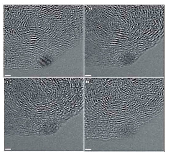 HRTEM images showing a nanodiamond forms from the anthracite upon exposure to the electron beam. The scale bar is 1 nm (Reproduced with permission from [100]).
