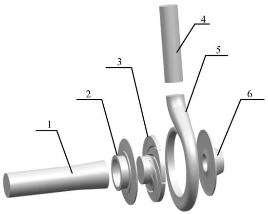 Pump model used in the simulation: 1. inlet pipe; 2. front chamber; 3. impeller; 4. outlet pipe; 5. volute; 6. rear chamber.