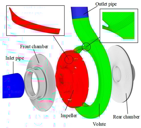 The three-dimensional software UG10.0 was used to model the three-dimensional full flow field of the model pump, and the clearance gap was included to consider the effects of the leakage on the performance of the pump, as shown in Figure 1. The calculation domain included an inlet pipe, a pump chamber, an impeller, a volute, and an outlet pipe. The pump chamber included a front chamber and a rear chamber. In order to achieve fully developed flow conditions, the inlet and outlet pipes of the calculation domain were appropriately extended.