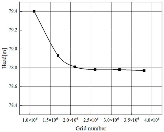Figure 3 shows the numerical simulation results under pure water conditions with different grid numbers. Comparing the efficiency, head, and power, we could find that the numerical results were getting stable with the increase of grid number. By considering the calculation cost and accuracy, the scheme with a total number of grids of 2,104,583 was finally selected for the following numerical calculation.