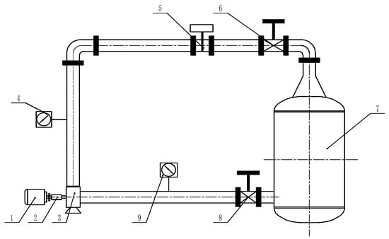 Schematic of test rig: 1. motor; 2. torque meter; 3. centrifugal pump; 4. outlet pipeline pressure gauge; 5. DN100 electromagnetic flowmeter; 6. outlet pipeline valve; 7. water tank; 8. inlet pipeline valve; 9. inlet pipeline pressure gauge.