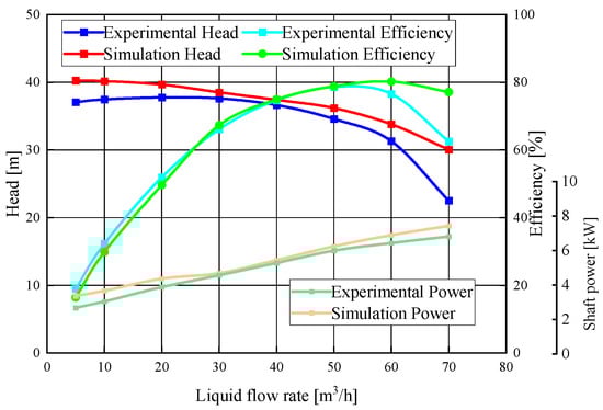 In order to verify the accuracy of the numerical calculation, the test bench shown in Figure 4 was established to carry out the energy performance test under different working conditions. A DN100 electromagnetic flowmeter with an accuracy of 0.5% was used to measure the flow rate. A WT2000 intelligent differential pressure transmitter and a torque meter with accuracies of 0.1% and 0.2%, respectively, were used to measure the head and torque, respectively. Figure 5 shows the comparison between the numerical results and the experiment data of the pump head, efficiency, and power. In order to fully analyze the changing trend of energy performance from the shut-off flow rate to the maximum flow rate, a total of eight operating flow rates were selected in the numerical simulation. The relative error of each curve tended to increase in the region deviating from the design flow rate (e.g., 5 and 70 m3/h), which was due to the phenomena of the severe turbulent flow and back-flow of the centrifugal pump operating in this region, resulting in an increase in the error between the numerical simulation and the experimental results. However, the tendency of each corresponding curve was almost the same. Under the design flow rates, the relative errors of the head, the efficiency, and the power between the numerical calculation and the experimental test were 4.4%, 2.95%, and 4%, respectively. The relative errors were all less than 5%, which indicated that the numerical simulation method chosen in this study is relatively precise.