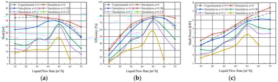 Effect of the inlet gas fraction on the energy performance of the pump: (a) flow–head curve; (b) flow–efficiency curve; (c) flow–shaft power curve.
