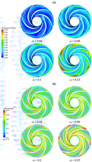 The cross-section of the impeller: (a) gas distributions under different inlet gas fractions, (b) liquid-phase velocity streamlines distribution under different inlet gas fractions.