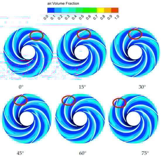 The transient flow field analysis was performed on the gas distribution in the impeller under an inlet gas content α of 0.1. Figure 8 shows the gas phase volume distribution on the cross-section under different impeller rotating angles. The distribution of the gas in the impeller channels varied with the rotation of the impeller. The gas phase was mainly gathered near the suction surface of the blades and gradually diffused along the impeller channels toward the outlet of the impeller. During the rotation of the impeller, the phenomenon of the gas accumulation and separation appeared along the flow direction. The separation phenomenon mainly occurred at the suction surface of the impeller blades adjacent to the outlet of the blades. Consequently, the gas in the impeller channels fell off at the outlet. The downstream part of the gas was separated from the impeller outlet and then entered the volute.