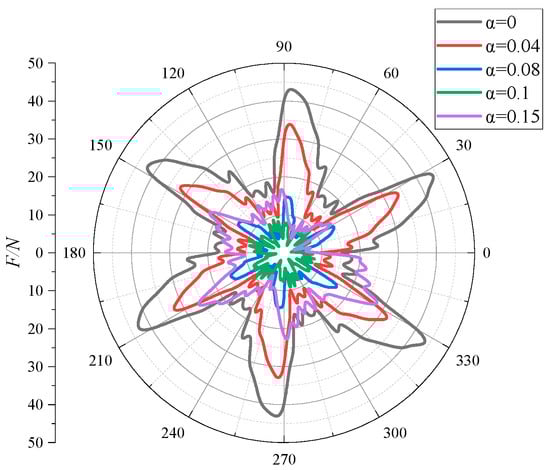 Figure 9 shows the radial force distribution of the impeller under different inlet gas contents at a rated flow. It can be seen from Figure 9 that the influence of the gas content change on the radial force was more obvious. The curve with an inlet gas content α of 0 was distributed in the outermost part. This curve shows a clear regularity, i.e., there are six distinct peaks in the curve, which are the same as the number of the blades of the impeller. It meant that when the inlet did not contain gas, the impeller was subjected to the greatest radial force and the curve fluctuation was strongly influenced by the number of blades. When the inlet gas content α increased from 0 to 0.1, the peak value of the radial force curve along the circumference gradually decreased. When the gas content reached 0.1, the curve fluctuation lost its original change law, and the number of peaks increased. The pattern of decreasing radial force due to the increasing gas content was similar to the research conclusions of Murakami et al. [32]. A small amount of gas in the impeller channels changed the flow velocity and direction of the original fluid, causing the change of radial force, so that the radial force on the impeller under gas-containing conditions was less than that under pure water conditions. For α = 0.15, the radial force curve fluctuated haphazardly and was no longer centrally symmetrical. The curve extreme large values in the range of 0–90° were smaller, compared with those in the other regions, but were still larger than the radial large values in the working condition with a gas content of 0.1. In combination with the above results, it was indicated that the magnitude of the radial force was nonpositively related to the gas content. The reason for this may be the change of the gas flow pattern in the impeller channels when the gas content reached a certain value [33]. The gas bubble flow aggregated into a slug flow, and the bubbles occupied most of the impeller channels. This resulted in the uneven distribution and the significant amplitude increase of the radial force on the impeller.