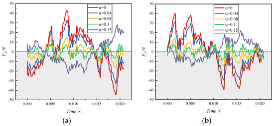 The time-domain distribution of the radial force component of the impeller under different inlet gas fractions: (a) x direction; (b) y direction.