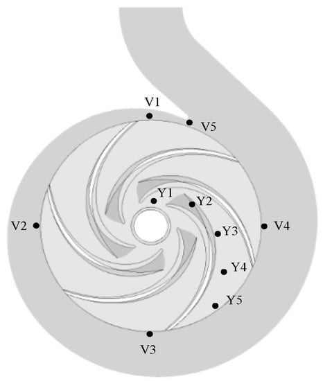 To study the pressure fluctuation in the impeller channels and volute tongue under different gas content conditions, 10 monitoring points were set up in the flow channel, as shown in Figure 11.