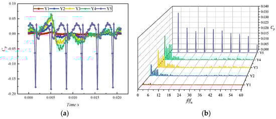From the frequency-domain distribution diagram, the pulsation intensity of the pulsation source increased from the inlet to the outlet of the impeller. The main frequency of Y5 pulsation at the monitoring point appeared at one time of the blade-passing frequency (BPF). The pressure pulsation coefficient amplitude at each harmonic frequency decreased compared to the main frequency amplitude but differed from the rapid reduction in pressure pulsation amplitude at the other four monitoring sites [36]. Once again, the pulsation source was shown to arise primarily at the impeller outlet.