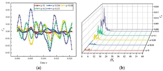 Pressure pulsation characteristics at each monitoring point in the impeller runner for α = 0: (a) time-domain distribution; (b) frequency-domain distribution.