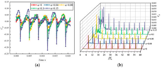 The time-domain diagram shown in Figure 10 was the variation of the radial force component with times in the x and y directions. It can be seen that, as the inlet gas content increased, the radial force component in the x direction generally became smaller and the curve fluctuation patterns were similar. When the gas content reached 0.15, the law of the curve fluctuation was disrupted.