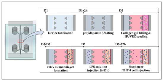 Schematic diagram of fabrication process for recreating blood vessel inflammation model in the microfluidic chip.