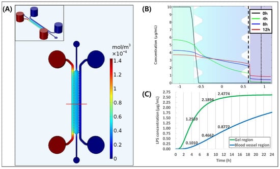 3D simulation of LPS diffusion in microfluidic chip. (A) The distribution of Lipopolysaccharide (LPS) concentration inside the channel at 12 h. (B) The graph of LPS distribution of red line of (A) at 0, 4, 8, and 12 h. (C) LPS concentration in gel region (dashed line in (B)) and in the blood vessel region (dotted line in (B)).
