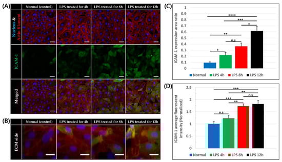 Intercellular adhesion molecule-1 (ICAM-1), which is a key adhesion molecule for leukocyte adhesion and trans-endothelial migration, is expressed at a low level on vascular endothelium and can be increased by inflammatory stimuli [45]. For this reason, ICAM-1 expression level of the vessel was observed and quantified in response of application of the inflammatory stimulus. As LPS was diffused into the constructed blood vessels, ICAM-1 expression of endothelial cells at the bottom of the BV channel and on side which is adjacent to the ECM region was shown (Figure 3A,B). Measuring ICAM-1 expression area ratio of basal plane of constructed blood vessel, the ratio was higher with LPS treatment for 4 h (22.04 ± 4.05%, p < 0.05), 8 h (36.25 ± 5.51%, p < 0.01), 12 h (61.81 ± 6.81%, p < 0.0001) than in normal condition (9.31 ± 1.37%) as shown in Figure 3C. In addition, when normalized average fluorescent intensity of ICAM-1 expression of endothelial cells on bottom, the intensity was also higher in 4 h (1.24 ± 0.12), 8 h (1.73 ± 0.09, p < 0.001), 12 h (1.82 ± 0.14, p < 0.001) than in normal condition (1 ± 0.11) as shown in Figure 3D. On the other hand, ICAM-1 expression of blood vessel was not significantly increased with 150 min of LPS treatment (Figure S2A–C). Overall, the ICAM-1 expressing endothelial cells and intensity of ICAM-1 expression were increased as LPS concentration increases and exposed for a longer time. Some endothelial cells exposed to LPS lost their actin filaments and gaps between cells were also observed. Since LPS treatment for 12 h made integrity of endothelial cells lost considerably, 12 h treatment was excluded in the following experiments.