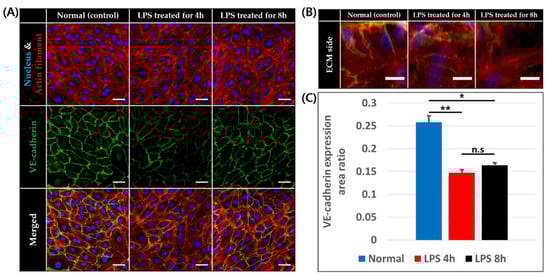 VE-cadherin is a cell–cell adhesion molecule specifically expressed on the endothelial cells, and is downregulated by inflammation [46]. The downregulation of VE-cadherin expression was observed for endothelial cells both on the base plane and ECM side of the BV channel and loss of actin filament and cell free region occurred when LPS was applied for 4 and 8 h, as shown in Figure 4A,B. Furthermore, we measured the VE-cadherin expression area ratio of the blood vessels on bottom part. The ratio was significantly lower with LPS treatment for both 4 h (14.71 ± 0.68%, p < 0.00001) and 8 h treatment (16.37 ± 0.57%, p < 0.0001) than in normal conditions (25.80 ± 1.39%) as expected. However, the VE-cadherin area ratio of the blood vessels treated by LPS for 4 and 8 h were not significantly different. However, significant downregulation of VE-cadherin was not observed in LPS treatment for 150 min (Figure S2D,E).