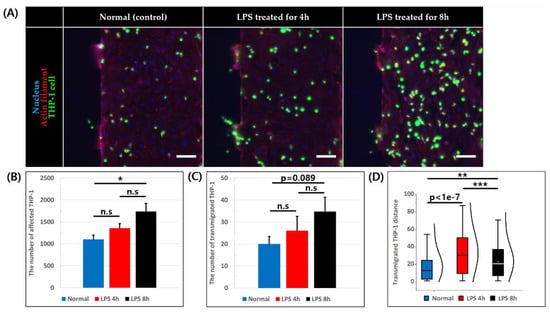 Although different from primary monocyte, THP-1 has been used as immune cell model in numerous studies [31]. According to THP-1 adhesion/migration assay in this study, the number of adhered and trans-endothelial migrated THP-1 tended to increase when LPS exposure time was longer. There was statistically significant difference between normal and LPS 8 h, but no significant difference between Normal and LPS 4 h and between LPS 4 h and LPS 8 h. These results are different from previous studies of in vitro 2D model that THP-1 cells adhered to and transmigrated through HUVECs more in the LPS-treated condition than the normal condition [13]. When monocytic THP-1 cells were co-cultured in blood vessel constructed in microfluidic chip, reduced ZO-1 and occludin expression, and permeability of HUVEC monolayer was observed in previous study [36]. This indicates that co-culturing THP-1 cell can also induce inflammation of endothelial cells. In our experiment, THP-1 cells continuously contact or roll over endothelial cells during seeding until the flow stopped. It is presumed that persistent contact or rolling of THP-1 cells induce endothelial cells to express adhesion protein on endothelial cells for all cases, possibly diminishing the distinct effect of different LPS treatment conditions.