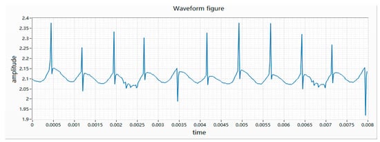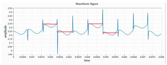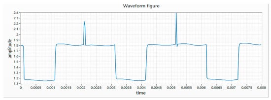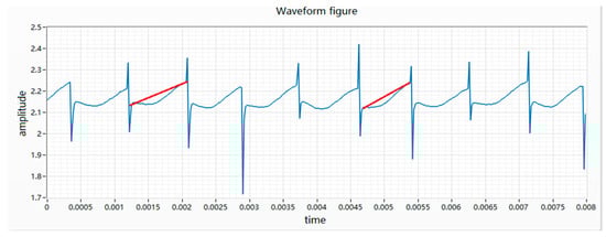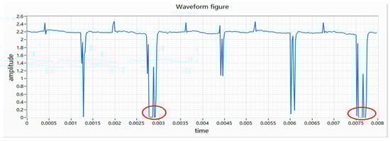 (5) The characteristic of the wave fall is that at a certain moment of rotation, the motor is momentarily disconnected, causing the voltage value across the resistor to be collected to be 0. The essence of the waveform drop is the moment when the commutator does not contact the electrode during the movement, which causes the circuit to open. Therefore, the voltage value collected by the acquisition card is 0, as shown in Figure 7.