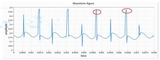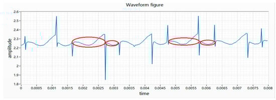 (6) The difference in height is characterized by the difference in height between two adjacent peaks and the voltage difference is greater than 0.12 V. The essence of the difference in height is that when the rotor of the vibration motor is wound, the winding resistance of two adjacent coils is different, resulting in different resistance values for each phase. After the power is turned on, the motor will turn to this place, which will cause the resistance of the whole circuit to change and the waveform will appear high or low, as shown in Figure 8.