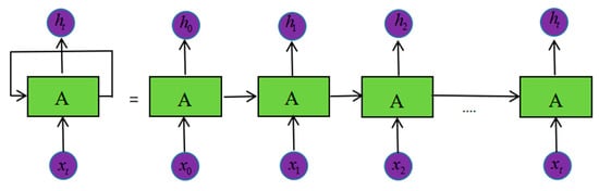 The recurrent neural network is mainly used in time series prediction and natural language processing. It is a neural network that automatically models sequence data. One of the key points of RNN is that it can be used to connect previous information to the current task, Thus, the output of the current sequence is related to the input of the previous sequence. As shown in Figure 12, from the network structure, the recurrent neural network will remember the previous information and use the previous input information to affect the output information of the following nodes. However, for a long sequence of networks, the RNN loses the ability to learn to connect to information far away as the spacing increases [,].