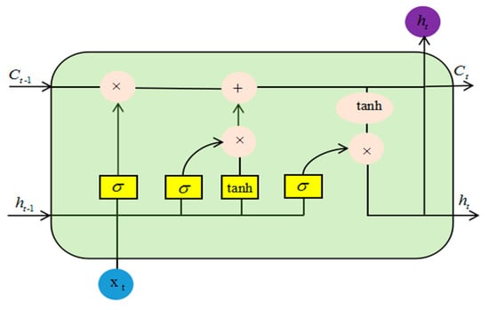 The LSTM neural network is a variant of the RNN network, which was first proposed by Hochreiter []. The improved LSTM network based on RNN can well solve the problem of gradient explosion and gradient disappearance. There are one or more cells in each LSTM neuron to record the current state information of LSTM neurons. Besides, there are three control gates in the LSTM network: the Forget Gate, the Output Gate, and the Input Gate, as shown in Figure 13.