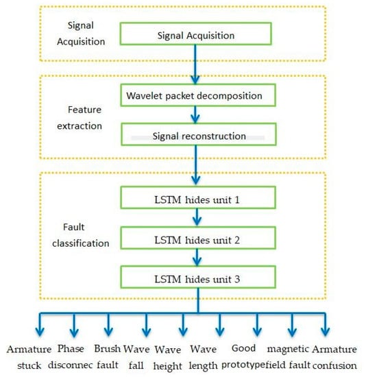 Deep learning is an emerging development field of recent years, which commonly includes the convolutional neural network (CNN), stack self-coding machine (SAE), recurrent neural network (RNN), and deep belief network (DBN) [,,,]. Deep learning has been applied in the field of motor fault diagnosis by its powerful nonlinear mapping ability. Jiang used multiscale unsupervised learning directly from the original vibration signal in learning useful features, to obtain rich and complementary failure mode information on different scales []. Kerboua Adlen, through the length of the two memories superimposed, formed a single layer of end-to-end network, trained in the original time series signal complex time relationship. The experimental results show that it has good robustness and real-time. The experimental results show that under different speeds and loads, the method can accurately detect fault types, which is feasible and effective []. Zhuang input four features with high classification rate into the RNN network. The experimental results show that the method can accurately detect the type of failure under different speeds and loads, which is feasible and effective. []. Ince used a shallow layer and adaptive one-dimensional CNN for real-time detection and classification of damaged rotor rows in induction motors []. Shu obtained the vibration signal of the motor through a wireless sensor, converted the obtained vibration signal into an image signal by wavelet transform, and then, used the histogram to equalize and enhance the processed image as the input of CNN. The test results show that the neural network method and several traditional methods have higher accuracy and real-time []. Wang preprocessed the original signal with a short-time Fourier-transform to obtain the corresponding time-frequency diagram. Then, CNN adaptive time-frequency feature extraction is used to diagnose the motor fault []. Jian constructed a cascading automatic encoder network to extract fault features of input data and improved the fault identification capability of the network by introducing random noise []. Currently, the main object of motor detection is ordinary motors, while the detection of micro-special motors is rare.