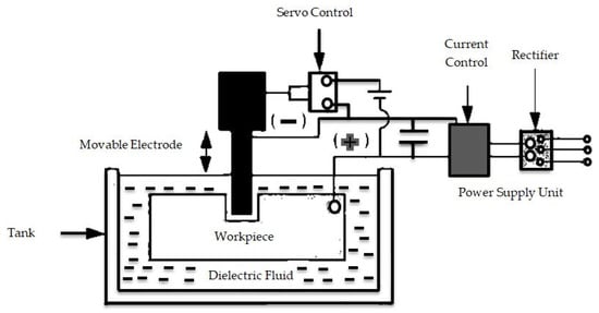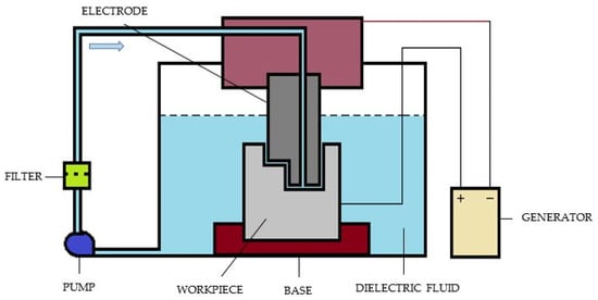 It is also called cavity-type EDM or volume EDM. It consists of an electrode and work piece submerged in an insulating liquid, such as, more typically, oil, or, less frequently, other dielectric fluids. The electrode and work piece are connected to a suitable power supply [27]. The power supply generates an electrical voltage between the two parts. As the electrode approaches the work piece, the dielectric breakdown occurs in the fluid, which forms a plasma channel and small spark jumps. These jumping sparks usually strike on one at a time. The sinker EDM process uses an electrically charged electrode that is configured to a specific geometry to burn the electrode’s geometry into a metal component. This process is commonly used in dies and tool manufacturing [28]. A schematic diagram of a sinker EDM is shown in Figure 3.