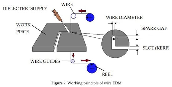 One of the most emerging non-conventional manufacturing processes is the wire electrical discharge machining [20,21]. Widely this process is used to machine hard materials and intricate shapes which are not possible with conventional machining methods. It is more efficient and economical. In wire EDM, an electric spark is created between an electrode and the work piece [22,23]. The spark is the visible evidence of the flow of electricity. This electric spark creates intense heat of temperature ranges from 8000 to 12,000 degree Celsius, which melts almost anything. The spark is carefully controlled and localized so that it only affects the surface of the materials. The EDM process does not affect the heat treat below the surface of the work piece. In wire EDM, the spark always takes place in the dielectric of de-ionized water. The conductivity of the water is carefully controlled for making an excellent environment for the EDM process. Here, the water acts as a coolant and flushes away the eroded metal particles [24]. The working principle of wire EDM is shown in Figure 2.