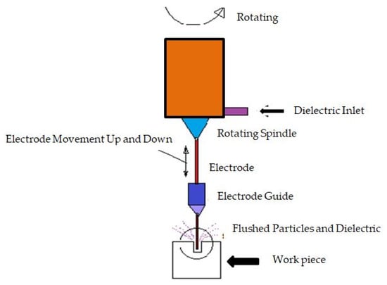Among all the non-conventional machining processes, electrical discharge machining (EDM) is one of the major and popular machining processes. Electrical discharge machining is also known as spark machining, spark eroding, die sinking, and wire burning or wire erosion. This technique is usually used to machine hard materials and high-temperature resistant alloys which are electrically conductive. The principle of the EDM technique is the use of thermoelectric energy to erode conductive components through rapidly occurring sparks between the uncontacted electrode and the workpiece [1]. It is an electro-thermal non-traditional machining process, where electrical energy is used to generate electrical spark, and the material is removed from the workpiece by a series of rapidly requiring current discharges between two electrodes separated by a dielectric liquid. It can be used to machine difficult geometries in small batches or even on a job-shop basis [2]. A large body of research discusses EDM processes with different objectives [3,4,5,6,7,8,9,10,11].