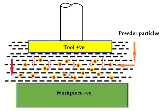 The influence of the powder in the PMEDM mainly depends on the powder parameters, that is, powder material, particle size, and particle concentration. There are many powder materials mixed with dielectric fluid including aluminum (20%), chromium (0.9%), graphite (5%), silicon (0.03%) or silicon carbide (0.3%). The previous studies used partial sizes of 10–25 μm, also the particle concentrations are about 6 g/L. These fine powders mixed to the dielectric fluid in the EDM, resulted in the reduced insulating strength and the generation of more spark [24]. Thus, table MRR and surface quality can be expected. The powder particles are energized and moved in crisscross directions. Under the action of applied electric force, these particles arrange in a suitable form at different locations in the sparking area [51]. Tool steel, alloy steel, and especially nickel-based super alloy Inconel-800 has been commonly used as workpieces by various researchers [45,52,53]. Other commonly used workpieces in PMEDM are H-11 Die Steel [54], AISI D2 Die Steel [41], Hastelloy [55], H 13 steel [56], W300 Die Steel [57], EN 31 Steel [58], AISI H-11 [59], Stavax [60], etc. The schematic representation of the principle of PMEDM is shown in Figure 5.