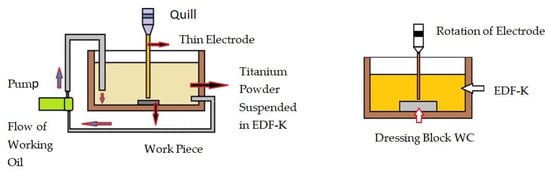 - Furutani, K.; Sato, H.; Suzuki, M. Influence of electrical conditions on performance of electrical discharge machining with powder suspended in working oil for titanium carbide deposition process. Int. J. Adv. Manuf. Technol. 2009, 40, 1093–1101. [Google Scholar] [CrossRef]