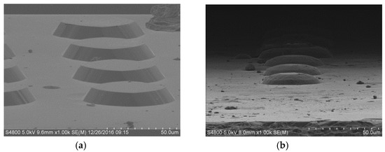Wafer manufacturing technologies commonly focus on silicon wafers with three principle orientations, namely {111}, {110}, and {100}. Among these three orientations, {100} silicon wafers are the most widely employed for the fabrication of microelectromechanical systems (MEMS) and complementary metal oxide semiconductor (CMOS) devices. In order to extend the range of curved 3D structures in {100} Si, several techniques such as grayscale mask lithography and DRIE [11,12] that can adjust the photoresist profile to be a spherical shape by reflow [13] and two-step anisotropic wet etching [14] have been reported. Grayscale lithography utilizes locally modulated exposure doses by changing glass mask transmission or projection lithography to induce diffraction. Differential exposure doses lead to multiple depths of exposed photoresist across the surface. In dry anisotropic etching, the structure is transferred to the silicon substrate to a specified depth corresponding to the height of the desired final structure. In the grayscale method, it is very difficult to fabricate a shape with precise modulation because of the limited range of etch selectivity (normally 0.3–2), nonuniformity, and surface roughness involved in following DRIE [13]. In a reflow-photoresist system, the height of the photoresist shape is modulated by varying the spin-coating rotation speed and the viscosity of the photoresist. These technologies, however, are restricted to a limited range of shapes or do not utilize batch processes. Nevertheless, the imprecise modulation of photoresist or the limited range of etch selectivity makes it difficult to control the shape and curvature of structures. In two-step KOH etching, however, a curved shape can be determined by three parameters: the first etching depth, the second etching depth, and the mask offset between the first and second etching steps. However, its profile is not smooth enough because of the crystallographic properties.