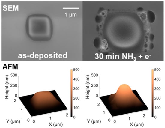 The following are available online at https://www.mdpi.com/2072-666X/11/8/769/s1, Figure S1: AFM Data of As-Deposited Pads Before NH3 Treatment, Figure S2: AFM Data for Various Stages of NH3 Treatment, Figure S3: Electron-Induced Reactions of NH3 with the Si Substrate, Figure S4: AFM Data for Various Stages of NH3 Treatment of H2O-Purified Deposits, Figure S5: ESD and TDS Data on Model Deposit Formation, Figure S6: TDS After NH3 Treatment.