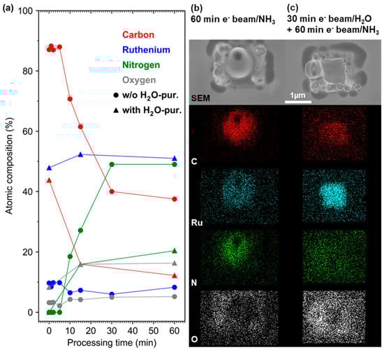 Results of NH3-assisted processing experiments in an environmental scanning electron microscope (ESEM): (a) Evolution of the atomic composition with time during combined electron beam and NH3 processing of deposits produced by FEBID from (EtCp)2Ru on a SiO2/Si substrate. The deposits were either used as is (circles) or pre-purified using H2O-assisted electron beam purification (triangles) in accordance with reference [8]. (b) SEM and EDX mapping images of a deposit that has been subject to the combined electron beam and NH3-processing for 60 min. (c) SEM and EDX mapping images of a deposit that has been subject to the same processing as in (b) but after H2O-assisted purification for 30 min.
