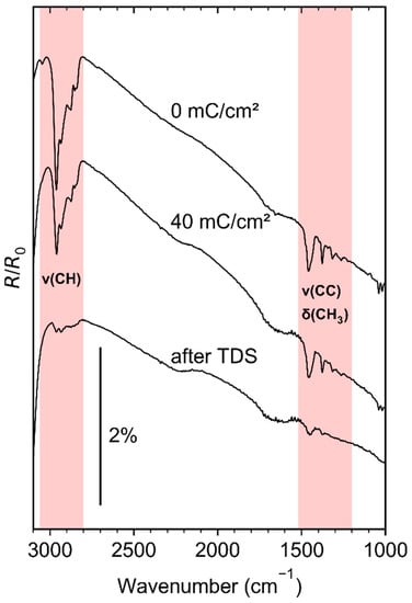 In the present study, the formation of the deposit was also monitored by RAIRS, which shows the CH stretching bands of the saturated Et side chains between 2800 and 3000 cm−1 as the most intense signals (Figure 3). In line with the layer thickness of 7–10 nm [9] and the fact that the typical mean free path of 31 eV electrons in condensed material is below 1 nm [30], some precursor in deeper layers is left intact after an exposure of 40 mC/cm2, as obvious from the remaining intensity of the CH stretching bands. After TDS, the remaining intensity was strongly reduced, and the band shape altered, pointing to removal of the intact precursor molecules that were not decomposed by electron irradiation.