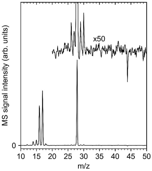 When NH3 is adsorbed on the deposit and electron exposure at E0 = 31 eV is resumed, MS acquired during ESD (Figure 4) shows dominant signals of NH3 (m/z 17) and N2 (m/z 28), the latter pointing to the electron-induced release of hydrogen [20,22]. Note that the intensity at m/z 16 (intensity ratio m/z 16:m/z 17 = ~0.8) is not enhanced as compared to the reference MS of NH3 [32]. Therefore, and in contrast to our previous study on ESD from cisplatin, there is no evidence for desorption of NH2• radicals during processing. Additional low-intensity signals at m/z 26–30 are present, indicating that more of a C2 product is formed. Here, the presence of m/z 30 points to C2H6 [32] in line with the reducing action of NH3. Intensity at m/z 30 could also be related to diazene (N2H2) desorption, but it would be surprising to detect such an unstable species but not the more stable NH3 irradiation product hydrazine (N2H4) at m/z 32 [33].