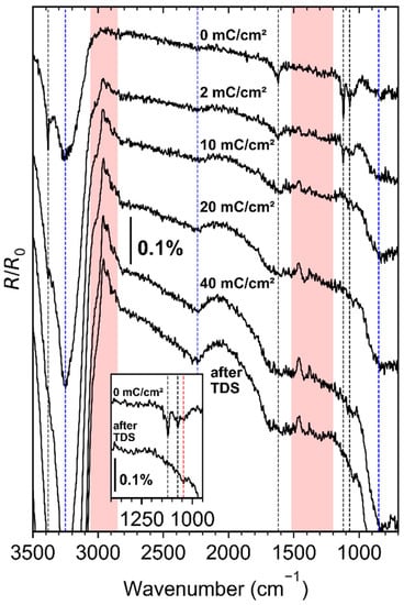 In Figure 5, RAIR spectra are shown for a NH3 film that has been condensed on top of an (EtCp)2Ru model deposit at T = 110 K in the pristine state (top), after several stages of electron exposure at E0 = 31 eV (middle), and after a final thermal annealing step to T = 450 K in the course of a TDS run (bottom). NH3 vibrations are marked with dashed black lines: At 3382 cm−1, the asymmetric NH3 stretch is observed, along with an asymmetric (1622 cm−1) and two symmetric deformations (1121 and 1072 cm−1). The band locations are in good agreement with assignments published for NH3 condensed on a highly ordered pyrolytic graphite (HOPG) surface [34]. The symmetric NH3 stretch at 3299 cm−1 [34] is overlaid with O–H stretches stemming from water ice frozen onto the entry window of the cooled infrared detector (all H2O-related vibrations [35] are marked with dashed blue lines in Figure 5).