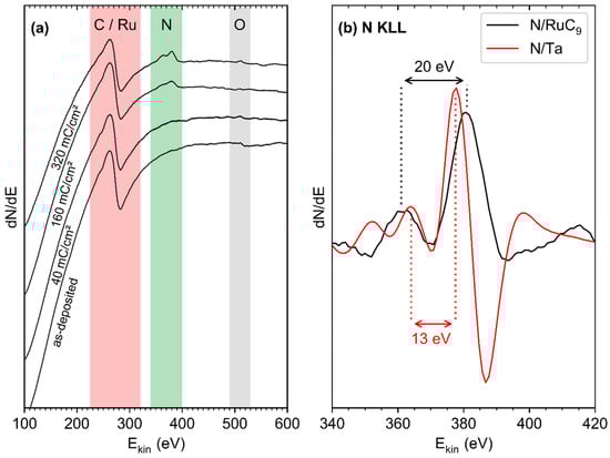 Unfortunately, the most intense Ru signal in AES (MNN at 277 eV [39]) and the C KLL signal (275 eV [39]) are located too close to each other to be resolved by our instrument. Therefore, a broad signal accounting for both species is the only feature observed for the as-deposited model deposit. With ongoing processing, this signal did not significantly decrease in intensity but a new feature at 386 eV appeared, indicative of N [39]. The N KLL signal in AES is a sensitive probe for the chemical state of N bound to another element. An earlier study has compared the N KVV signals in AES measured in differential mode from diverse N-containing elemental layers [40]. While the exact position of the N KVV bands shifted slightly with increasing N content, as exemplified for Ru-N samples, it was shown that the fine structure of the bands is characteristic of the element in which N was incorporated [40]. In particular, both Ta–N and Ru–N revealed narrow distances between the minima and maxima, while covalent nitrides such as C–N exhibited wide peak structures [40]. For the present AES data (Figure 6b), the distances between the main maxima are on average 13 eV in the case of Ta reacted with NH3, in excellent agreement with the spectrum reported in reference [40], where a similar line shape was also observed for Ru–N. In contrast, the AES data obtained after processing of the carbonaceous Ru model deposits (Figure 6a,b) revealed a spacing near 20 eV between the two main maxima, this time in excellent agreement with the previous data for C–N samples [40]. This clearly shows that N from the adsorbed NH3 is incorporated in the C residue during electron exposure and does not react with Ru.