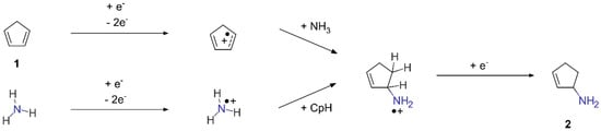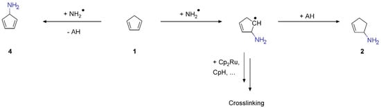 The NH2• radicals produced according to Equations (1) and (2) may also add to C=C double bonds present in the hydrocarbon residue. This results in direct amination of these moieties. The resulting amine radical can be saturated by addition of AH. Note that radical addition can initiate a chain reaction involving radical site propagation and, thus, extends the degree of crosslinking in the deposit. Furthermore, in alkenes with allylic H atoms, substitution of one of these H atoms by a radical under release of AH is another conceivable reaction. In the case of 1, this reaction would result in formation of cyclopenta-2,4-dien-1-amine (4). Scheme 2 visualizes the reaction pathways involving NH2• radicals.