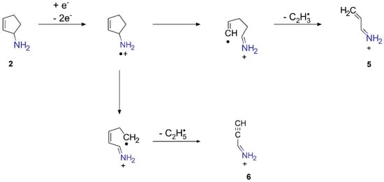 After EI, cyclic C5 amines, as can be formed via the reactions proposed above, typically fragment via ring-opening α cleavage followed by H rearrangement [47]. The EI-MS of 2, 3, or 4, however, has not been reported to the best of our knowledge. We, therefore, briefly discuss the major dissociation channel following EI of cyclopentanamine (C5H11N, M•+ at m/z 85) as a simple example for fragmentation of such cyclic C5 amines. The EI-MS of cyclopentanamine exhibits the most intense signal at m/z 56 [32]. This fragment results from the loss of a C2 radical from M•+ [32]. Scheme 3 shows how this kind of fragmentation following EI would proceed in 2. The loss of C2 radicals yields new CC double or triple bonds that may either crosslink or be subject to hydroamination under prolonged electron exposure in the presence of NH3.