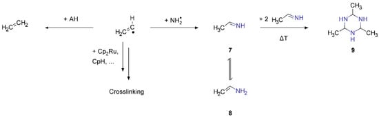 The C2 radicals released during fragmentation, i.e., vinyl (C2H3•) and ethyl (C2H5•) radicals in the case of 2, may react with AH produced through NH3 decomposition to yield C2H4 and C2H6, contributing to ESD intensities in the range m/z 26–30 (Figure 4). Recombination of C2H3• with NH2• radicals would yield ethanimine (7) or its tautomer vinylamine (8), respectively (Scheme 4). It is known that 7 trimerizes at temperatures above 230 K to yield the acetaldehyde ammonia trimer (9) [48]. This reaction could take place during room temperature processing in the electron microscope as well as during annealing of the model deposits after processing and would yield again larger, nitrogen-containing hydrocarbon species that are very likely retained in the processed deposit. Recombination of C2H5• with NH2• would accordingly yield ethylamine (C2H5NH2). In previous studies, it was argued that radical densities in molecular films during electron exposure with the same electron gun as used herein are low and radical recombination reactions are, thus, unlikely to occur [49]. The observation of a hydrocarbon residue with high nitrogen content along with the presence of C2 hydrocarbons in ESD (Figure 4) during processing does not allow us to fully rule out such radical recombination reactions. The initiation of chain reactions by C2H3• and C2H5• is, however, a more likely scenario.