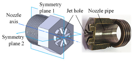 The structure of the porous nozzle is shown in Figure 1. There are four jet holes which are symmetrically distributed at the center and eight fan-shaped bosses at the front of the nozzle to adjust the air flow state and reduce noise. The middle of the nozzle is a hexagonal structure, which facilitates the removal and installation of the nozzle; the rear thread of the nozzle is used to fix the nozzle.