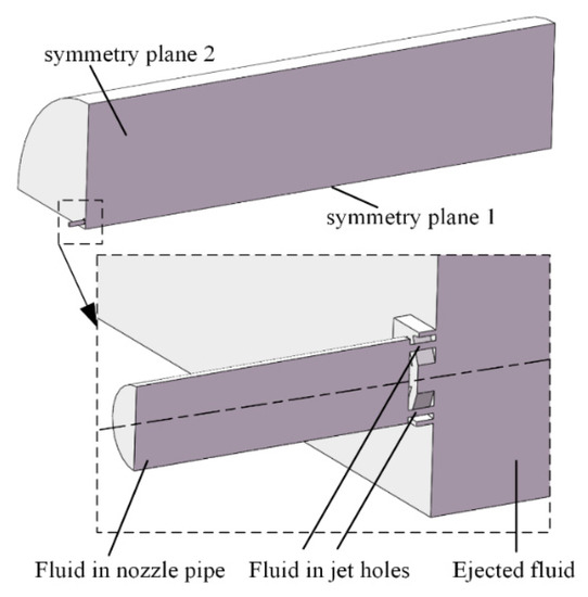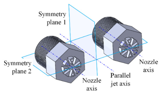 In the process of the dual parallel jet, the two nozzles are parallel and symmetrically arranged along symmetry plane 1, and the jet holes adjacent to the side are located on symmetry plane 2. The dual parallel jet arrangement of the porous nozzles is shown in Figure 2.