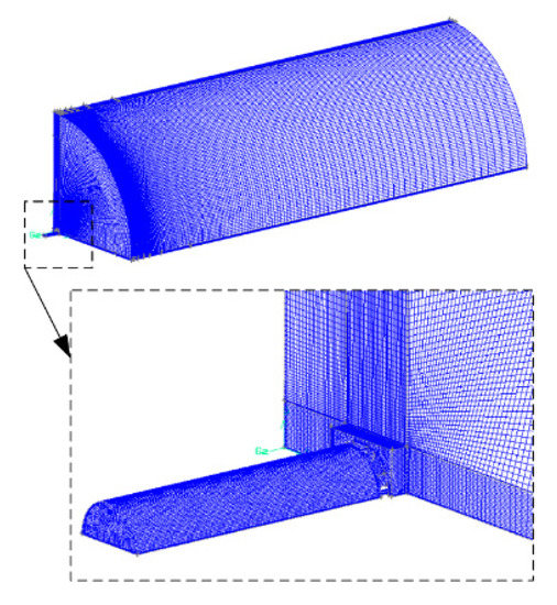 Three sets of mesh independence analysis are carried out. The grid size at the jet outlet is 0.1 mm and the grid size increases with the jet distance. The computational domain is meshed with 2,676,830 grids, as shown in Figure 4.